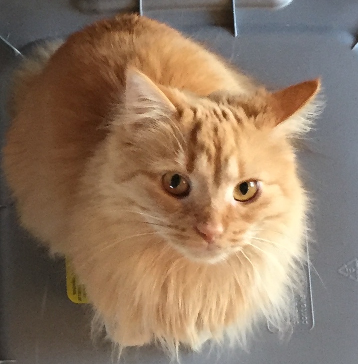 We took him and his sister in just a week after we got Whitey. We used to have an orange and white indoor-outdoor cat, the only orange cat in the vicinity. He disappeared one day, and shortly afterward, one of our neighbors said they thought his kittens were over at their house and offered them to us, so we had to take them. Though his sister was a pain to catch, Buffy was as good-natured, chatty, and gullible as he is today — one treat got him out from hiding, and he’s been enjoying his life ever since.