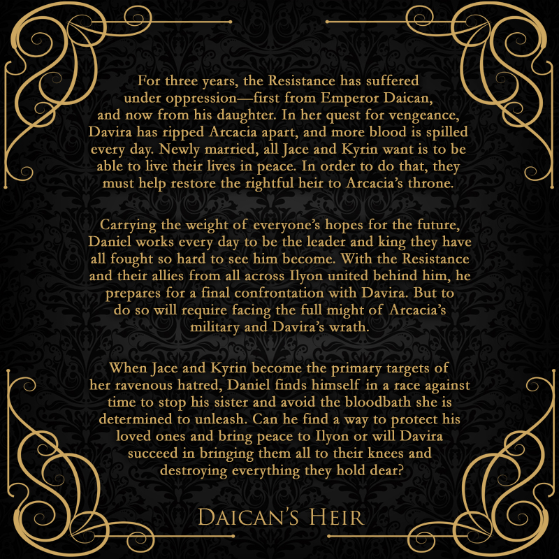 For three years, the Resistance has suffered under oppression—first from Emperor Daican and now from his daughter. In her quest for vengeance, Davira has ripped Arcacia apart, and more blood is spilled every day. Newly married, all Jace and Kyrin want is to be able to live their lives in peace. In order to do that, they must help restore the rightful heir to Arcacia’s throne.